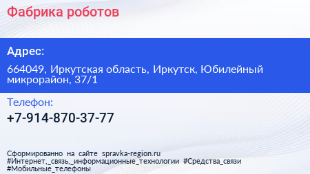 Фабрика роботов по адресу 664049, Иркутская область, Иркутск, Юбилейный микрорайон, 37/1 в дальнейшем Организация, размещена в следующих категориях:
