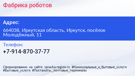 Фабрика роботов по адресу 664038, Иркутская область, Иркутск, посёлок Молодёжный, 11 в дальнейшем Организация, размещена в следующих категориях: