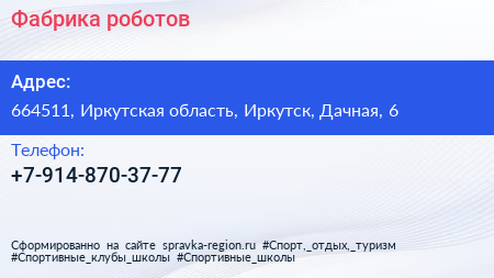 Фабрика роботов по адресу 664511, Иркутская область, Иркутск, Дачная, 6 в дальнейшем Организация, размещена в следующих категориях: