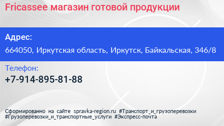 Fricassee, магазин готовой продукции по адресу 664050, Иркутская область, Иркутск, Байкальская, 346/8 в дальнейшем Организация, размещена в следующих категориях: