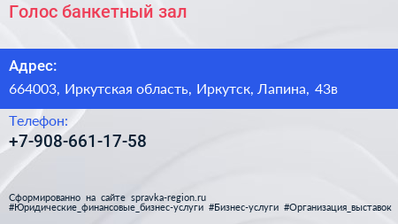 Голос, банкетный зал по адресу 664003, Иркутская область, Иркутск, Лапина, 43в в дальнейшем Организация, размещена в следующих категориях: