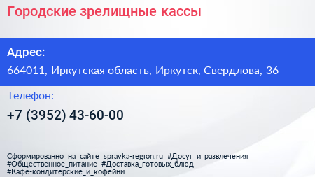 Городские зрелищные кассы по адресу 664011, Иркутская область, Иркутск, Свердлова, 36 в дальнейшем Организация, размещена в следующих категориях: