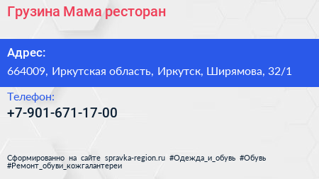 Грузина Мама, ресторан по адресу 664009, Иркутская область, Иркутск, Ширямова, 32/1 в дальнейшем Организация, размещена в следующих категориях: