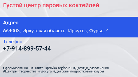 Густой, центр паровых коктейлей по адресу 664003, Иркутская область, Иркутск, Фурье, 4 в дальнейшем Организация, размещена в следующих категориях: