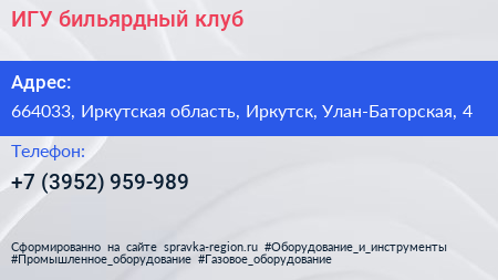 ИГУ, бильярдный клуб по адресу 664033, Иркутская область, Иркутск, Улан-Баторская, 4 в дальнейшем Организация, размещена в следующих категориях: