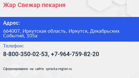 Жар Свежар, пекарня по адресу 664007, Иркутская область, Иркутск, Декабрьских Событий, 105а в дальнейшем Организация, размещена в следующих категориях: