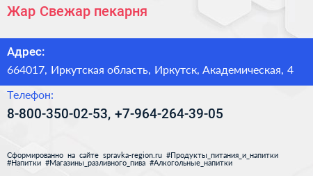 Жар Свежар, пекарня по адресу 664017, Иркутская область, Иркутск, Академическая, 4 в дальнейшем Организация, размещена в следующих категориях: