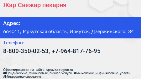 Жар Свежар, пекарня по адресу 664011, Иркутская область, Иркутск, Дзержинского, 34 в дальнейшем Организация, размещена в следующих категориях: