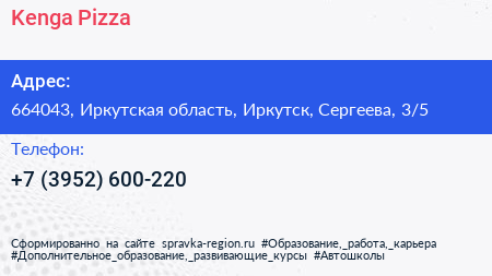Kenga Pizza по адресу 664043, Иркутская область, Иркутск, Сергеева, 3/5 в дальнейшем Организация, размещена в следующих категориях: