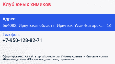 Клуб юных химиков по адресу 664082, Иркутская область, Иркутск, Улан-Баторская, 16 в дальнейшем Организация, размещена в следующих категориях: