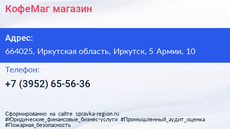 КофеМаг, магазин по адресу 664025, Иркутская область, Иркутск, 5 Армии, 10 в дальнейшем Организация, размещена в следующих категориях: