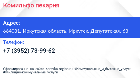 Комильфо, пекарня по адресу 664081, Иркутская область, Иркутск, Депутатская, 63 в дальнейшем Организация, размещена в следующих категориях: