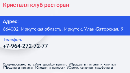 Кристалл, клуб-ресторан по адресу 664082, Иркутская область, Иркутск, Улан-Баторская, 9 в дальнейшем Организация, размещена в следующих категориях:
