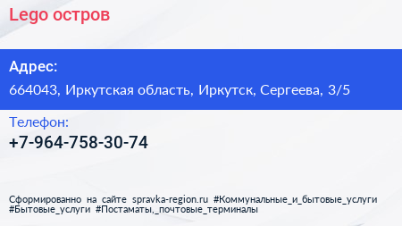 Lego остров по адресу 664043, Иркутская область, Иркутск, Сергеева, 3/5 в дальнейшем Организация, размещена в следующих категориях: