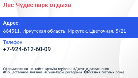 Лес Чудес, парк отдыха по адресу 664511, Иркутская область, Иркутск, Цветочная, 5/21 в дальнейшем Организация, размещена в следующих категориях: