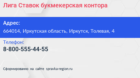 Лига Ставок, букмекерская контора по адресу 664014, Иркутская область, Иркутск, Толевая, 4 в дальнейшем Организация, размещена в следующих категориях: