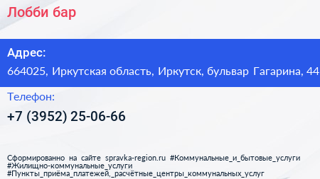 Лобби-бар по адресу 664025, Иркутская область, Иркутск, бульвар Гагарина, 44 в дальнейшем Организация, размещена в следующих категориях:
