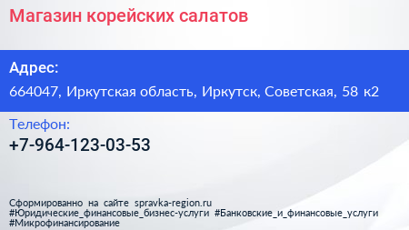 Магазин корейских салатов по адресу 664047, Иркутская область, Иркутск, Советская, 58 к2 в дальнейшем Организация, размещена в следующих категориях: