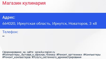 Магазин-кулинария по адресу 664020, Иркутская область, Иркутск, Новаторов, 3 к8 в дальнейшем Организация, размещена в следующих категориях: