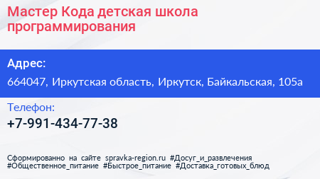 Мастер Кода, детская школа программирования по адресу 664047, Иркутская область, Иркутск, Байкальская, 105а в дальнейшем Организация, размещена в следующих категориях: