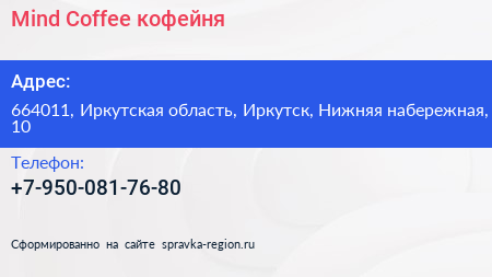 Mind Coffee, кофейня по адресу 664011, Иркутская область, Иркутск, Нижняя набережная, 10 в дальнейшем Организация, размещена в следующих категориях: