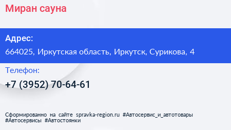 Миран, сауна по адресу 664025, Иркутская область, Иркутск, Сурикова, 4 в дальнейшем Организация, размещена в следующих категориях:
