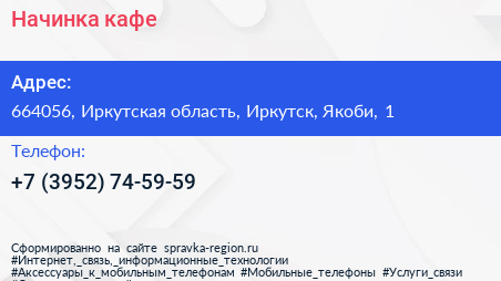 Начинка, кафе по адресу 664056, Иркутская область, Иркутск, Якоби, 1 в дальнейшем Организация, размещена в следующих категориях: