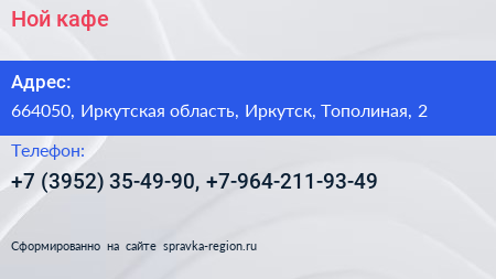 Ной, кафе по адресу 664050, Иркутская область, Иркутск, Тополиная, 2 в дальнейшем Организация, размещена в следующих категориях: