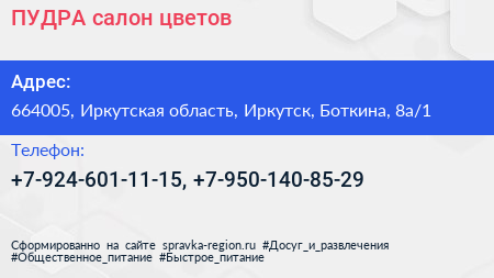 ПУДРА, салон цветов по адресу 664005, Иркутская область, Иркутск, Боткина, 8а/1 в дальнейшем Организация, размещена в следующих категориях: