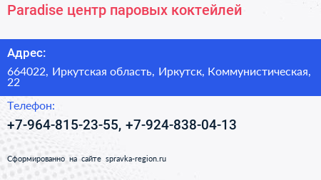 Paradise, центр паровых коктейлей по адресу 664022, Иркутская область, Иркутск, Коммунистическая, 22 в дальнейшем Организация, размещена в следующих категориях: