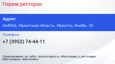 Париж, ресторан по адресу 664056, Иркутская область, Иркутск, Якоби, 35 в дальнейшем Организация, размещена в следующих категориях: