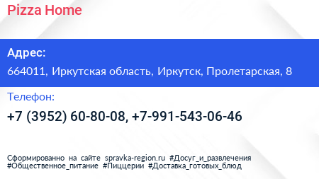 Pizza Home по адресу 664011, Иркутская область, Иркутск, Пролетарская, 8 в дальнейшем Организация, размещена в следующих категориях: