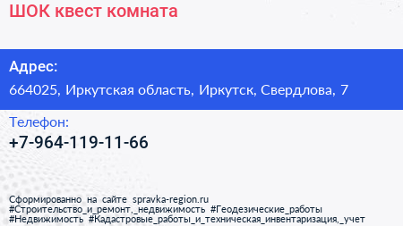 ШОК, квест-комната по адресу 664025, Иркутская область, Иркутск, Свердлова, 7 в дальнейшем Организация, размещена в следующих категориях: