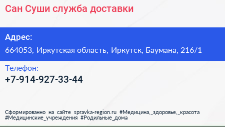 Сан Суши, служба доставки по адресу 664053, Иркутская область, Иркутск, Баумана, 216/1 в дальнейшем Организация, размещена в следующих категориях: