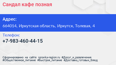 Сандал, кафе-позная по адресу 664014, Иркутская область, Иркутск, Толевая, 4 в дальнейшем Организация, размещена в следующих категориях: