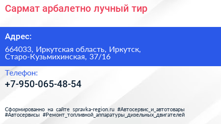 Сармат, арбалетно-лучный тир по адресу 664033, Иркутская область, Иркутск, Старо-Кузьмихинская, 37/16 в дальнейшем Организация, размещена в следующих категориях: