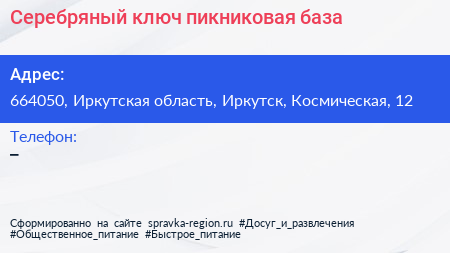 Серебряный ключ, пикниковая база по адресу 664050, Иркутская область, Иркутск, Космическая, 12 в дальнейшем Организация, размещена в следующих категориях: