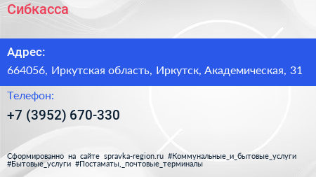 Сибкасса по адресу 664056, Иркутская область, Иркутск, Академическая, 31 в дальнейшем Организация, размещена в следующих категориях: