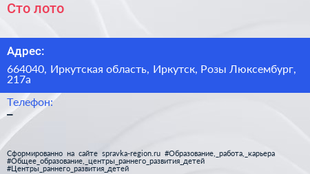 Сто лото по адресу 664040, Иркутская область, Иркутск, Розы Люксембург, 217а в дальнейшем Организация, размещена в следующих категориях: