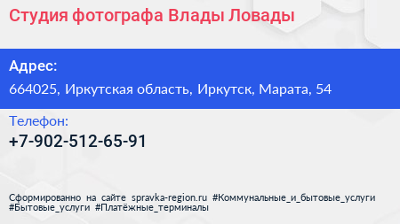 Студия фотографа Влады Ловады по адресу 664025, Иркутская область, Иркутск, Марата, 54 в дальнейшем Организация, размещена в следующих категориях: