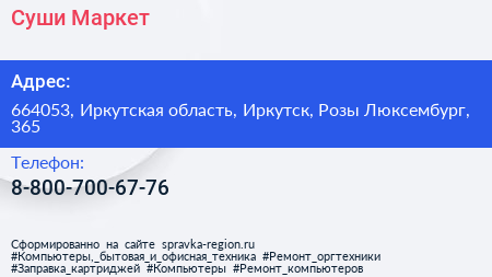 Суши-Маркет по адресу 664053, Иркутская область, Иркутск, Розы Люксембург, 365 в дальнейшем Организация, размещена в следующих категориях: