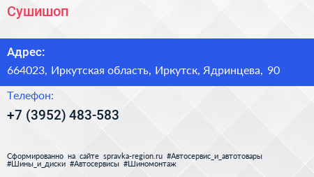 Сушишоп по адресу 664023, Иркутская область, Иркутск, Ядринцева, 90 в дальнейшем Организация, размещена в следующих категориях: