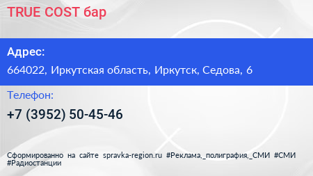 TRUE COST, бар по адресу 664022, Иркутская область, Иркутск, Седова, 6 в дальнейшем Организация, размещена в следующих категориях: