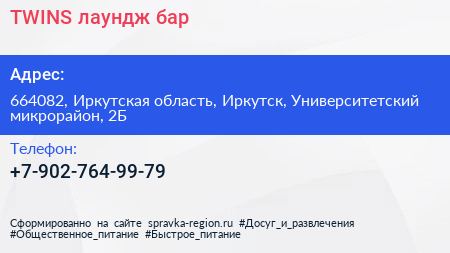 TWINS, лаундж-бар по адресу 664082, Иркутская область, Иркутск, Университетский микрорайон, 2Б в дальнейшем Организация, размещена в следующих категориях: