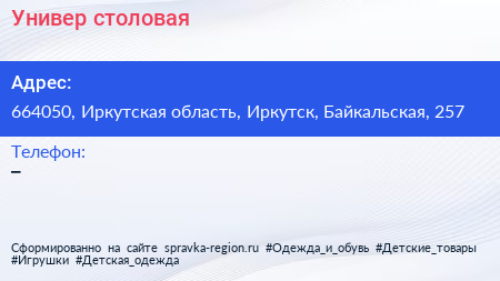 Универ, столовая по адресу 664050, Иркутская область, Иркутск, Байкальская, 257 в дальнейшем Организация, размещена в следующих категориях: