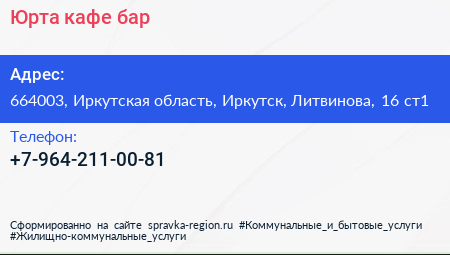 Юрта, кафе-бар по адресу 664003, Иркутская область, Иркутск, Литвинова, 16 ст1 в дальнейшем Организация, размещена в следующих категориях: