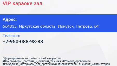 VIP, караоке-зал по адресу 664035, Иркутская область, Иркутск, Петрова, 64 в дальнейшем Организация, размещена в следующих категориях: