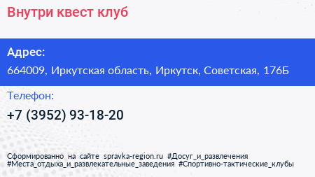 Внутри, квест-клуб по адресу 664009, Иркутская область, Иркутск, Советская, 176Б в дальнейшем Организация, размещена в следующих категориях: