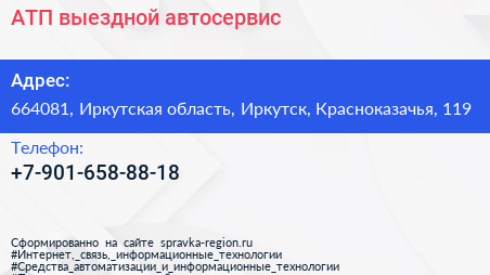 АТП, выездной автосервис по адресу 664081, Иркутская область, Иркутск, Красноказачья, 119 в дальнейшем Организация, размещена в следующих категориях: