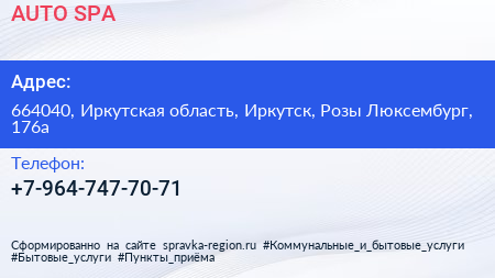 AUTO SPA по адресу 664040, Иркутская область, Иркутск, Розы Люксембург, 176а в дальнейшем Организация, размещена в следующих категориях: